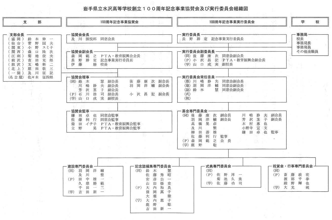 岩手県立水沢高等学校創立百周年記念事業協賛会 会長 及川源悦郎(水沢高校同窓会長) 副会長 長野耕定(記念事業実行委員長) 副会長 森岡範之(水沢高校PTA・教育振興会長) 副会長 伊藤 勝(水沢高校校長)